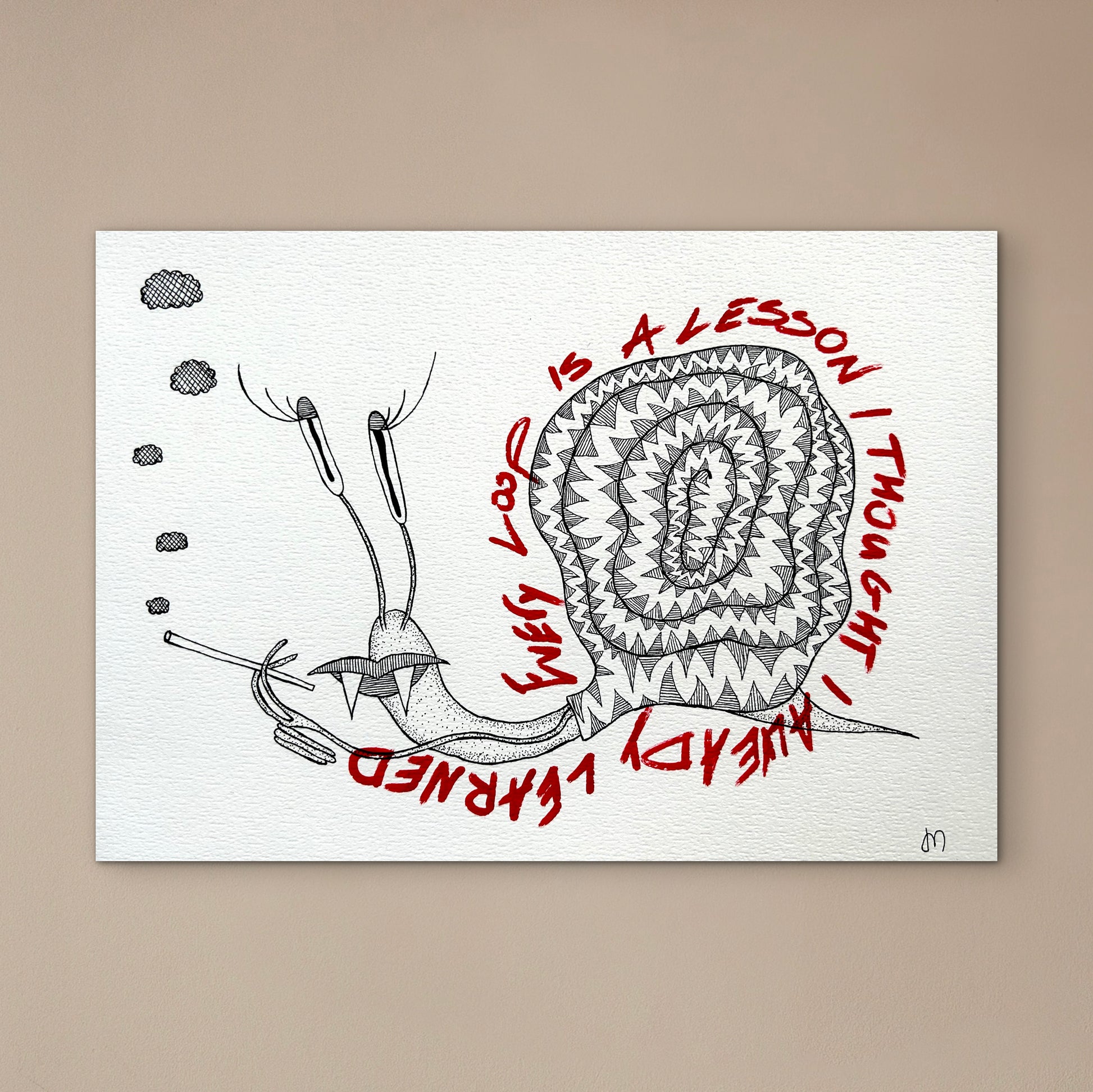 This work shows a tired snail smoking a cigarette, its shell surrounded by the words: every loop is a lesson I thought I already learned. Made in a moment of urgency while preparing for exhibition, the drawing captures the feeling of exhaustion and repetition, where each slow turn seems to carry the weight of familiar struggle.