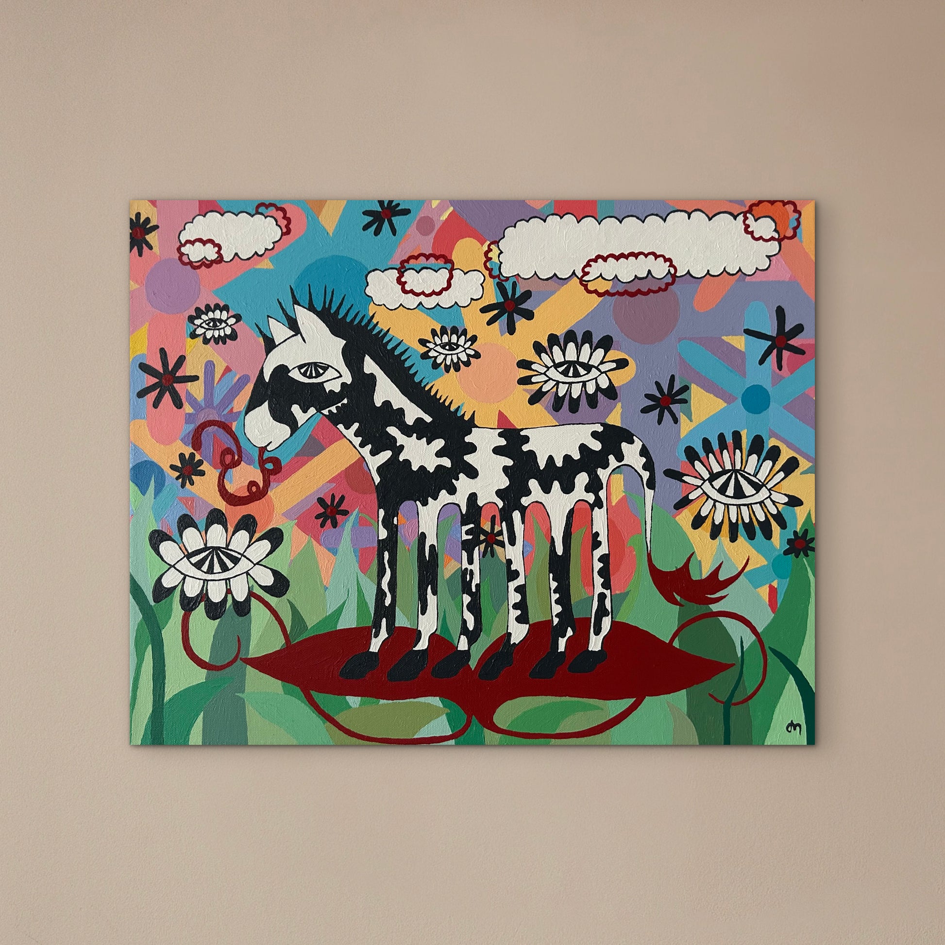 This painting is the next step of Not Enough Legs, first sketched and then completed in pen on paper. On canvas, the six-legged horse and the eye-flowers return in full colour, shifting the work into a brighter and more playful tone while still carrying the strangeness of its earlier form.