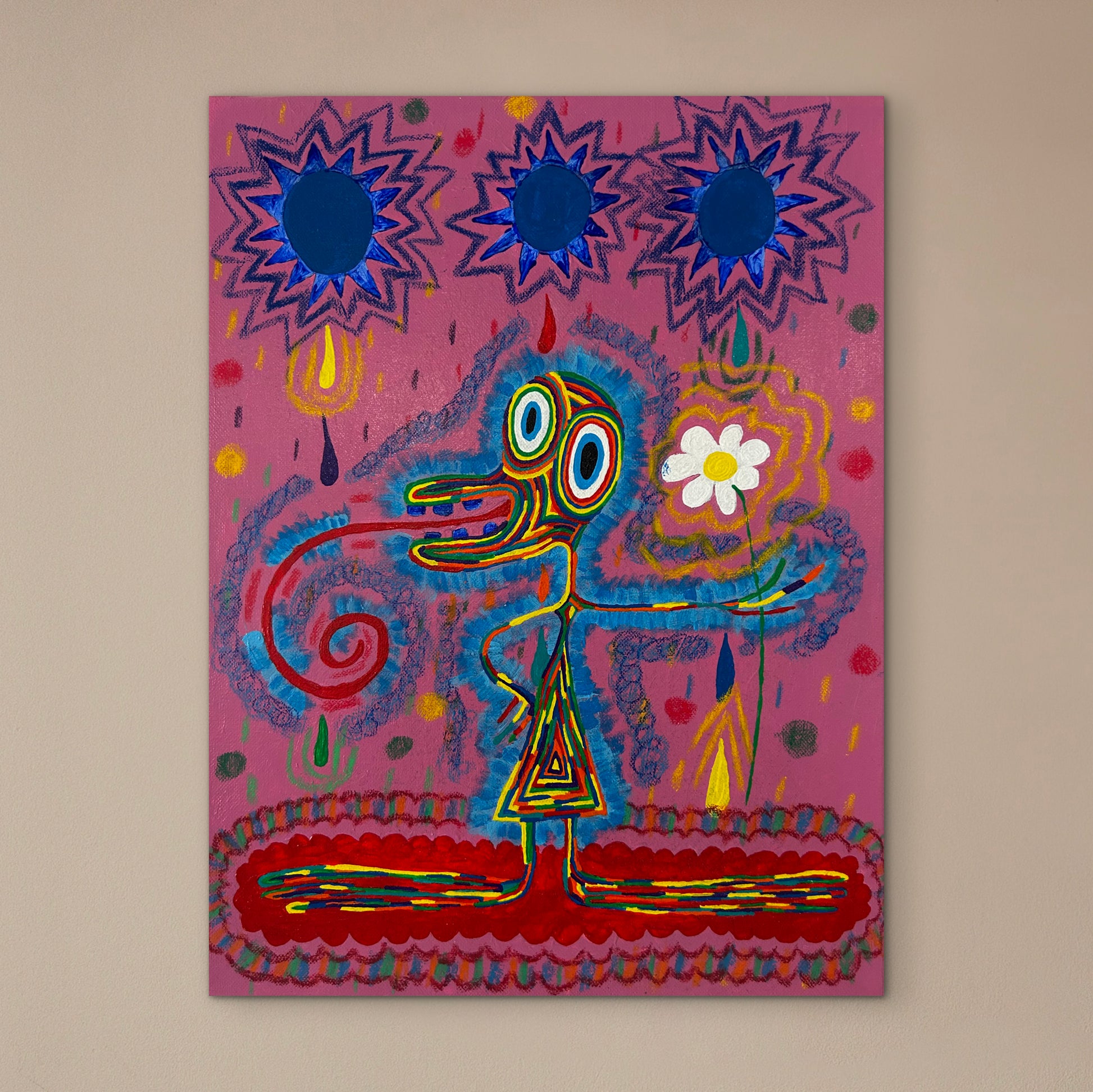 The Sun is Not Yet Set came to life in a moment of play and exploration. The creature, the three blue suns, and all these colours are all part of an experiment that turned into something strangely alive. It’s a piece about finding joy in the unexpected.